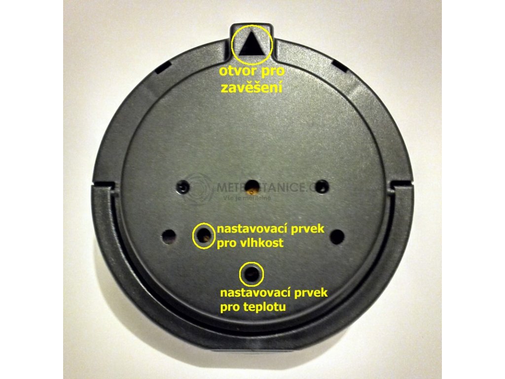 - Vlhkoměr disponuje nastavovacími prvky jak kalibraci relativní vlhkosti tak pro kalibraci teploty (viz. obrázek)