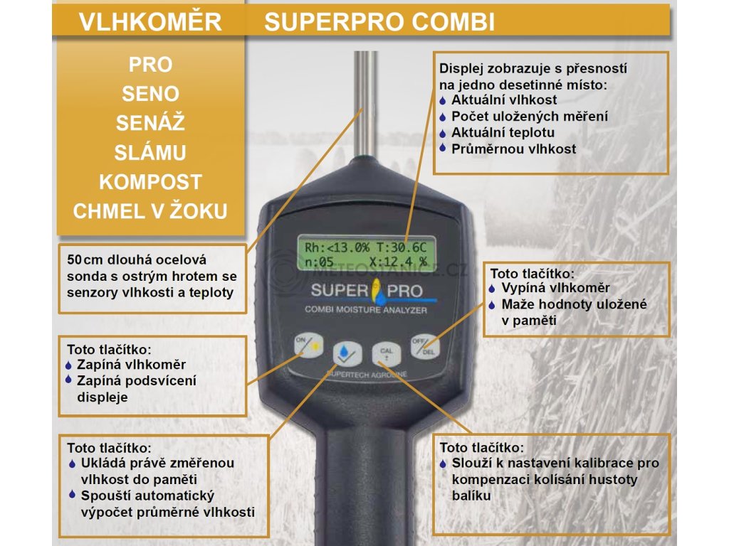 SuperPro Combi je nová generace spolehlivých přístrojů pro měření vlhkosti sena, slámy a senáže, vyzkoušený i při měření vlhkosti chmele v žoku, kompostu apod.